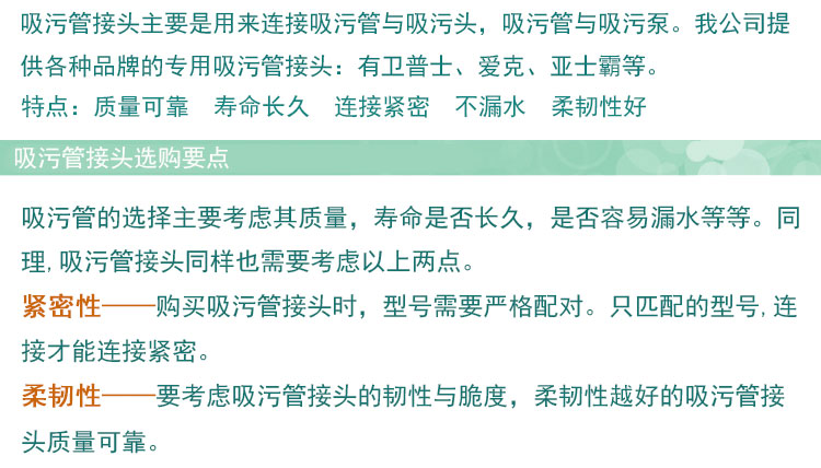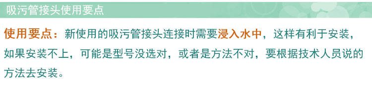 使用要點(diǎn):新使用的吸污管接頭連接時(shí)需要浸入水中,這樣有利于安裝,如果安裝不上,可能是型號(hào)沒選對(duì),或者是方法不對(duì),要根據(jù)技術(shù)人員說的方法去安裝。