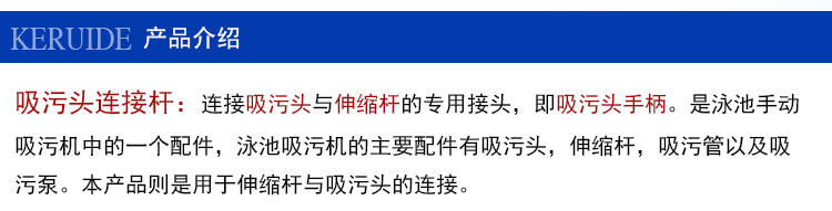 吸污頭連接桿:吸污頭與伸縮桿連接的接頭。是泳池手動(dòng)吸污機(jī)中的一個(gè)配件,泳池吸污機(jī)的主要配件有吸污頭,伸縮桿,吸污管以及吸污泵。本產(chǎn)品是用于伸縮桿與吸污頭的連接。