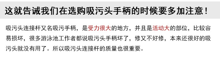 吸污頭連接桿又名吸污手柄,是受力很大的地方,比較容易損壞,很多游泳池工作者都說(shuō)吸污頭手柄壞了,修又不好修,本來(lái)還很好的吸污頭就沒(méi)有用了。