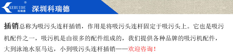 插銷(xiāo)總稱(chēng)為吸污頭連桿插銷(xiāo),作用是將吸污頭連桿固定于吸污頭上。它也是吸污機(jī)配件之一,吸污機(jī)是由很多的配件組成的,我公司提供吸污機(jī)配件全:各種品牌的,大到泳池水泵馬達(dá),小到吸污頭連桿插銷(xiāo)。