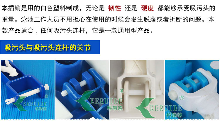 本插銷(xiāo)是用高檔的白色塑料制成,無(wú)論是韌性還是硬度都能夠承受任何吸污頭的重量。泳池工作人員不用擔(dān)心在使用的時(shí)候會(huì)發(fā)生脫落或者折斷的問(wèn)題。本款產(chǎn)品適合于任何吸污頭連桿,它是一款通用型產(chǎn)品。