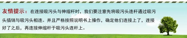 友情提示:在連接吸污頭與伸縮桿時(shí),我們要注意先將吸污頭連桿通過(guò)吸污頭插銷(xiāo)與吸污頭相連。并且嚴(yán)格按照說(shuō)明書(shū)上操作,確定他們連接上了,連接好了之后,在連接伸縮桿于吸污頭連桿上。