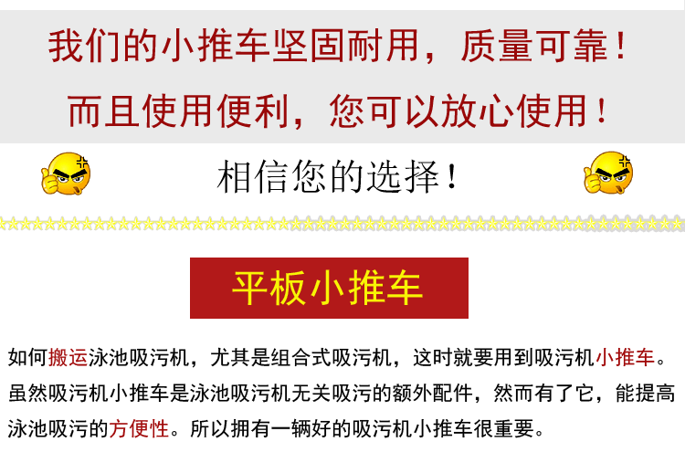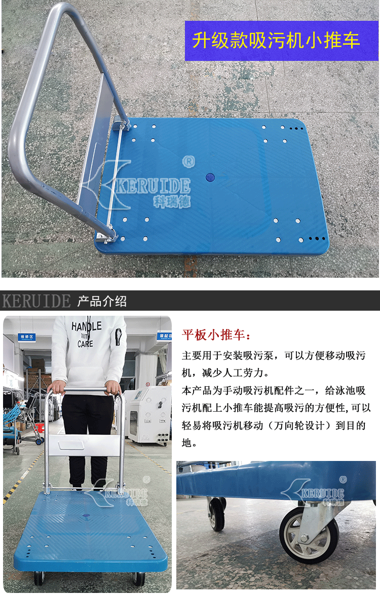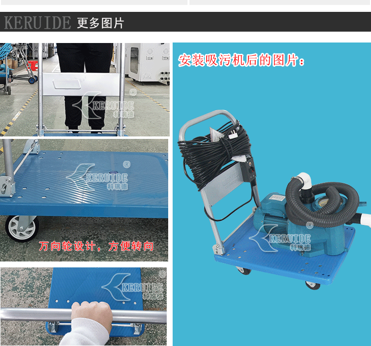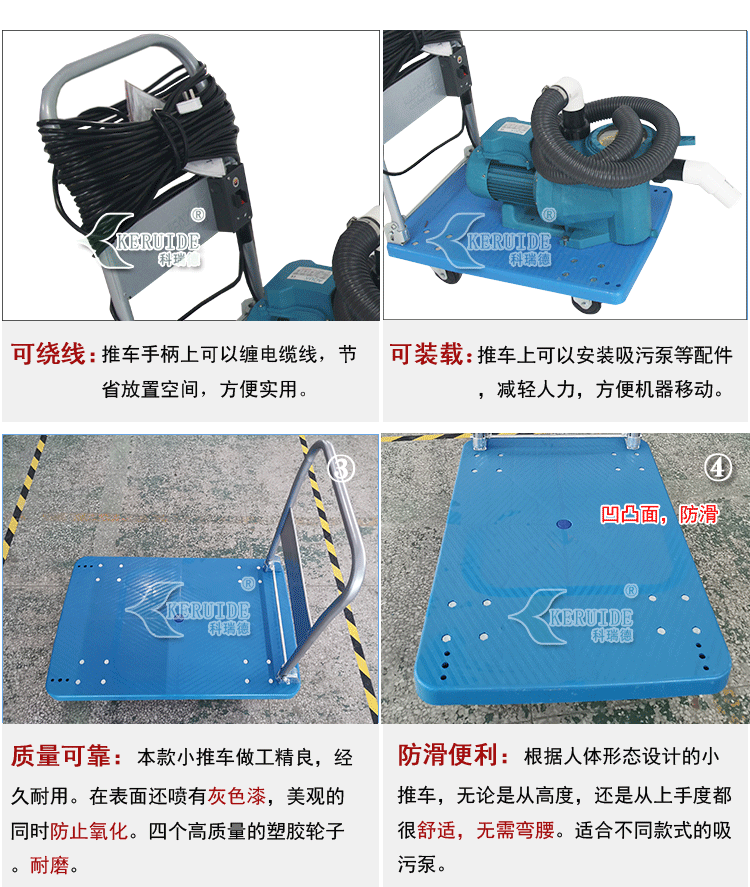 3,便利性:根據(jù)人體形態(tài)設(shè)計(jì)的小推車,無(wú)論是從高度,還是從上手度都非常契合。適合不同款式的吸污泵。