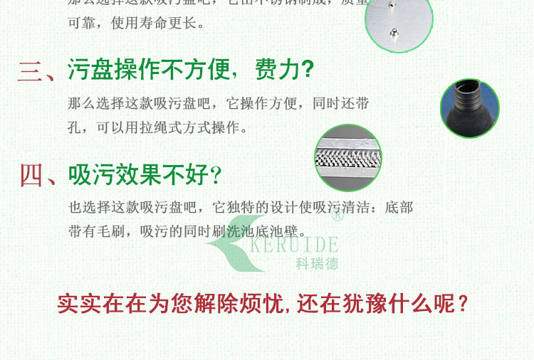 如果你覺得你的吸污盤不夠大,吸污花的時間很多,那么就選擇這種吸污盤吧,吸污面積大,吸污速度快,可以減少吸污時間。如果你覺得你的吸污盤質量不夠好,怕使用的時間不夠長,那么選擇這款吸污盤吧,它全部由不銹鋼制成,質量有保障,使用壽命長。如果你覺得你的泳池吸污盤操作不方便,費力,那么選擇這款吸污盤吧,它操作方便,同時還帶孔,可以用拉繩式方式操作。如果你覺得你的泳池吸污盤效果不好,也選擇這款吸污盤吧,它獨特的設計使吸污清潔:底部帶有毛刷,吸污的同時刷洗池底池壁。
