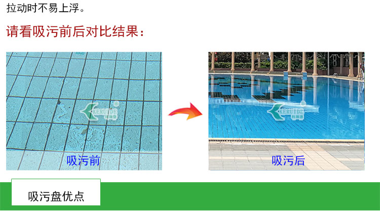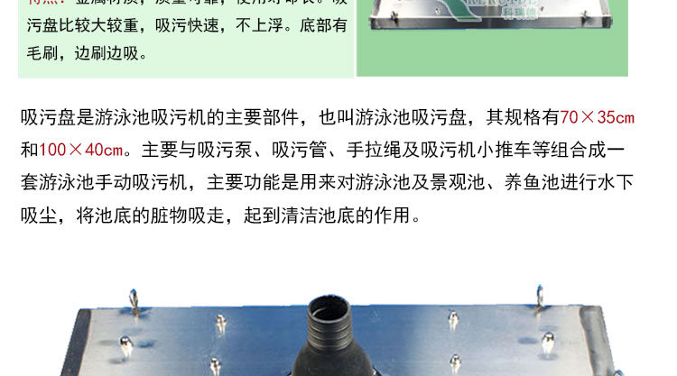 吸污盤是大型泳池吸污機的主要部件,也叫游泳池吸污盤,主要與吸污泵、吸污管、手拉繩及吸污機小推車等組合成一套游泳池手動吸污機,主要功能是用來對游泳池及景觀池、養(yǎng)魚池進行水下吸塵,將池底的臟物吸走,起到清潔池底的作用。
