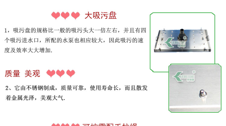 1,吸污盤的規(guī)格比一般的吸污頭大一倍左右,并且有四個吸污進水口,所配的水泵也相應較大,因此加快吸污的時間