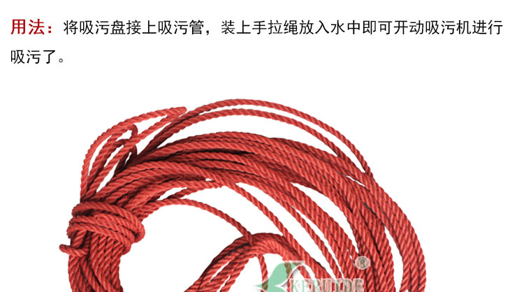 【用法】:將吸污盤接上鋼絲吸污管,裝上手拉繩放入水中,啟動吸污機就可以進行吸污了。