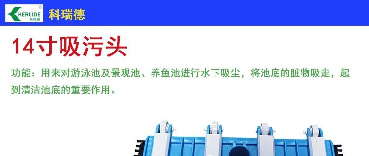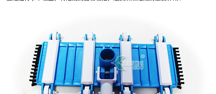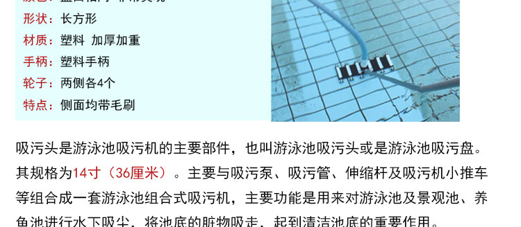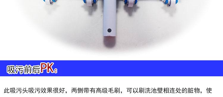 吸污頭:本吸污頭為14英寸帶刷毛塑料吸污頭,配塑料手柄、側(cè)面均帶毛刷,吸污時(shí)還可以對(duì)池底進(jìn)行刷洗,可以邊吸污邊刷洗池底,操作靈活、方便。