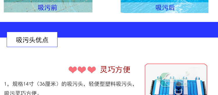 1、規(guī)格14寸(36厘米)的吸污頭,輕便型塑料吸污頭,吸污靈巧方便。