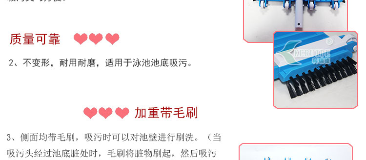 2、質(zhì)量可靠,不變形,耐用耐磨,適用于任何材質(zhì)的泳池池底吸污。