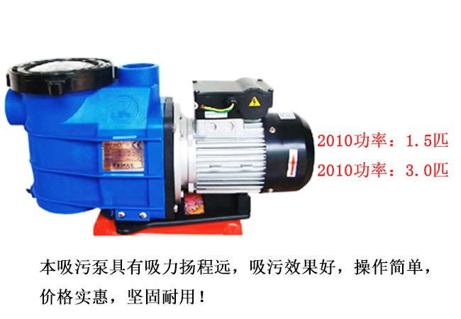 吸污泵是泳池吸污機的主要組成部分,本吸污泵是快巴牌吸污泵,功率有1.5匹與3.0匹兩種,適合各種泳池,水上樂園,景觀池的吸污用。