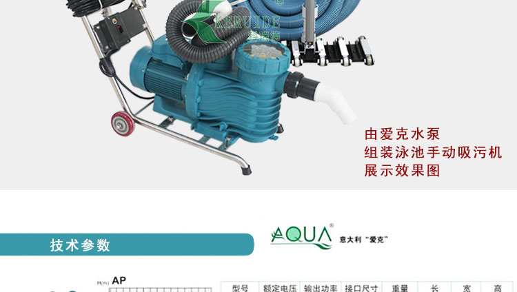 在國內(nèi),愛克吸污泵質(zhì)量可靠、簡易的操作、多種型號規(guī)格,它分為不同的功率,結(jié)合各種大小泳池使用,本款吸污機適合小型泳池或,溫泉桑拿處的吸污,單人操作,使用方便。