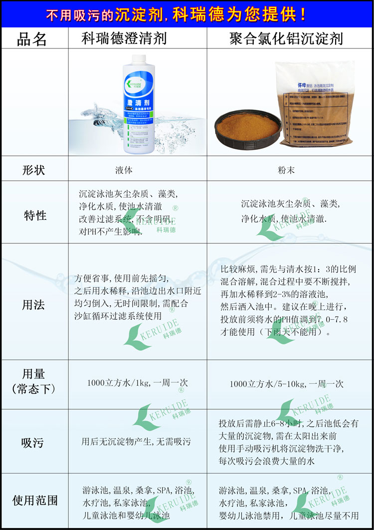 ? ? ? ?科瑞德澄清劑是一種濃縮的溶于水的DMDAAC聚合物,帶有正電荷,所以是陽離子澄清劑,很容易和泳池、溫泉及各種桑拿水療池水中帶有負(fù)電荷的懸浮顆粒結(jié)合,然后通過傳統(tǒng)的泳池過濾系統(tǒng)將懸浮物過濾掉,讓水變得清澈湛藍(lán)!它不含明礬,對(duì)PH不產(chǎn)生影響,使用方便,無需稱量無需提前溶解,無時(shí)間限制,直接沿著出水口附近均勻倒入即可,用后無沉淀物產(chǎn)生,無需吸污,能節(jié)省大量的水資源。