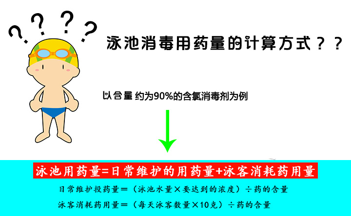 每天投藥量=(泳池水量×要達到的濃度)÷藥的含量
