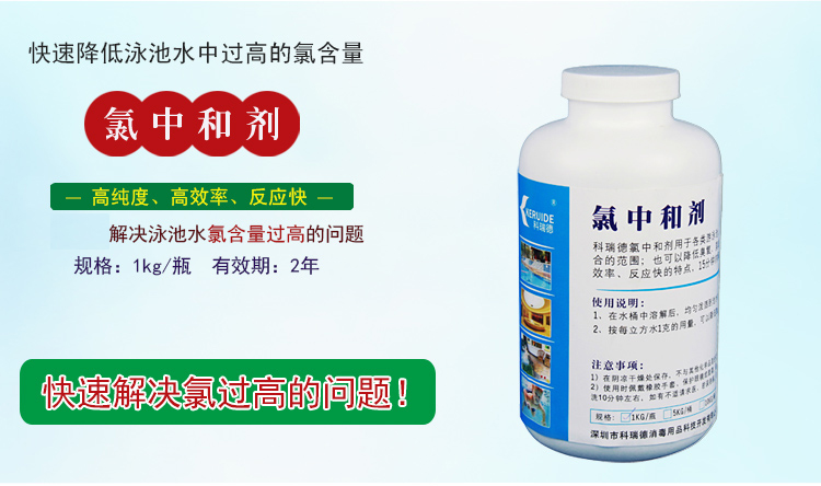 2.如果時間比較緊急,例如有人要來檢查了或者馬上要開館了來不及補(bǔ)水的話,可以使用氯中和劑來進(jìn)行降低;科瑞德泳池氯中和劑適用于各類游泳池、桑拿池、溫泉池,其作用是將池水過高的氯含量降低到適合的范圍,也可以降低臭氧、溴或各種氧化類沖擊性處理劑的濃度。其產(chǎn)品具有高純度、高效率、反應(yīng)快的特點,解決氯含量過高的問題。使用方法簡單,在水桶中溶解后,均勻潑灑到池水中即可。1000立方水使用1kg氯中和劑,可以降低3mg/L的氯含量。