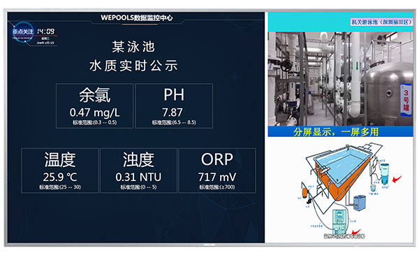 分屏設(shè)置我們可以利用公示屏給公眾展示游泳池設(shè)施及景點(diǎn)、宣傳等,使用這種水質(zhì)顯示屏可以達(dá)到多種效果,只要登入就可以顯示,右上角可以根據(jù)用戶需求來(lái)設(shè)計(jì),游泳館視頻及日常水質(zhì)維護(hù)圖片等,非常實(shí)用。