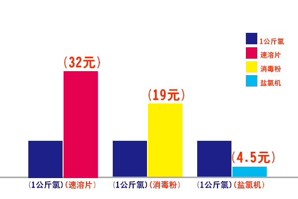 衛(wèi)普士鹽氯機(jī)每1000g/h產(chǎn)氯量來(lái)計(jì)算。鹽氯機(jī)每4.5公斤鹽每小時(shí)能產(chǎn)1公斤氯,而鹽是比較廉價(jià)的,以1元/kg,那么產(chǎn)1kg的氯,只需要4.5元;