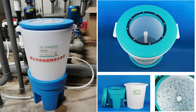 簡(jiǎn)單的游泳池投藥裝置是由加藥泵和液體大桶組合而成的。這種投藥系統(tǒng)適合用于液體(漂白水)消毒劑的泳池安裝使用,但是液體消毒劑在運(yùn)輸、存儲(chǔ)、使用等存在安全隱患,所以現(xiàn)在游泳池水消毒一般選用固體消毒劑。從而這種投藥方式不適合投加固體消毒劑(如:消毒片/粒/粉),因?yàn)槭褂眠@種自動(dòng)投藥裝置,消毒藥裝入桶內(nèi),會(huì)使消毒藥一次性浸泡而造成失效快、氯揮發(fā)、消耗快等,當(dāng)消毒劑溶液抽入泳池后,水達(dá)不到很好的消毒殺菌作用。所以很多游泳池場(chǎng)所雖然安裝了這種自動(dòng)投藥裝置,也很少使用。