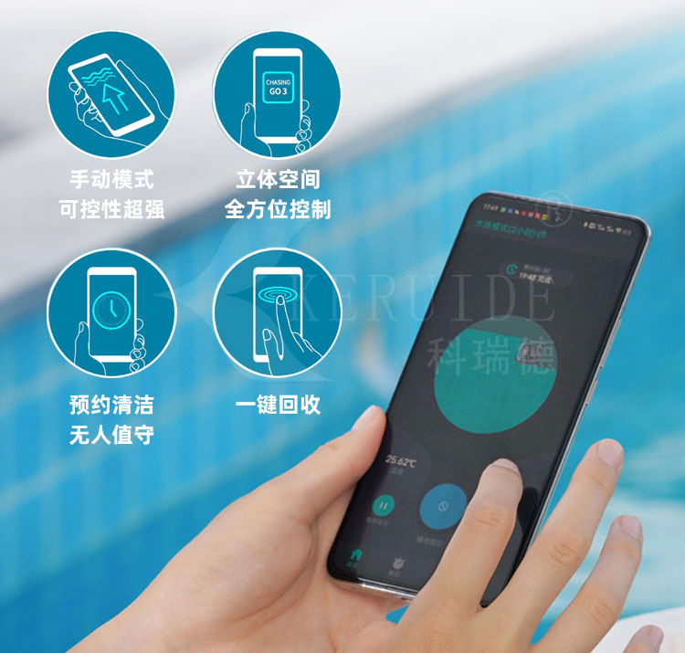 可以通過(guò)專(zhuān)屬軟件手機(jī)遠(yuǎn)程操作預(yù)約清潔{定時(shí)/延時(shí)}無(wú)需人工值守,一鍵可收回,輕松的進(jìn)行水下清潔,讓你不再厭倦吸塵工作,夏季泳客多,每天閉館做一次吸污完全不會(huì)耽誤場(chǎng)館第二天的運(yùn)作。
