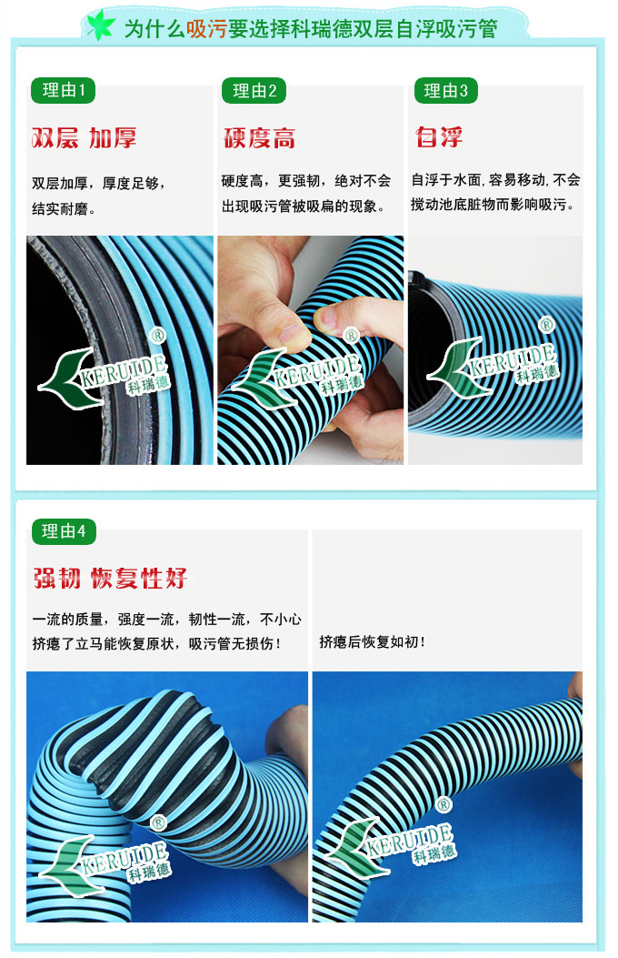 【優(yōu)點(diǎn)】:雙層管,夠硬度,不會(huì)被吸扁;能自浮于水面容易移動(dòng),并且不會(huì)攪動(dòng)池底的臟物而影響吸污效果。