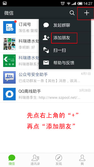 1,在微信頁面右上角點(diǎn)擊“+”,然后點(diǎn)擊“添加朋友”;