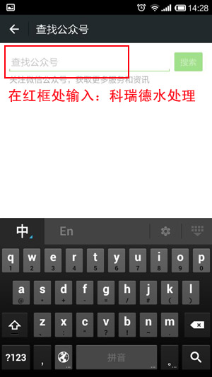 4,輸入后點(diǎn)“搜索”,然后再出現(xiàn)的公眾號中選擇點(diǎn)擊“科瑞德水處理”;