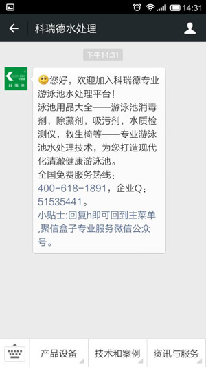7,此時,你已經(jīng)成功關(guān)注“科瑞德水處理”的微信公眾號了,以后公眾號發(fā)信息,你就可以再第一時間收到,諸如此類信息: