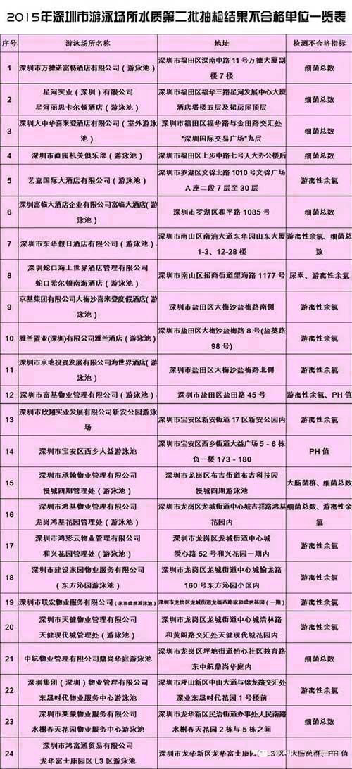 自上次抽檢以來,深圳各大游泳館都在緊鑼密鼓的進(jìn)行泳池水質(zhì)維護(hù),以應(yīng)對(duì)第二批泳池水質(zhì)檢測。而2015年游泳場所水質(zhì)檢測第二批抽檢結(jié)果公布后,仍然有24家泳池衛(wèi)生狀況不合格。
